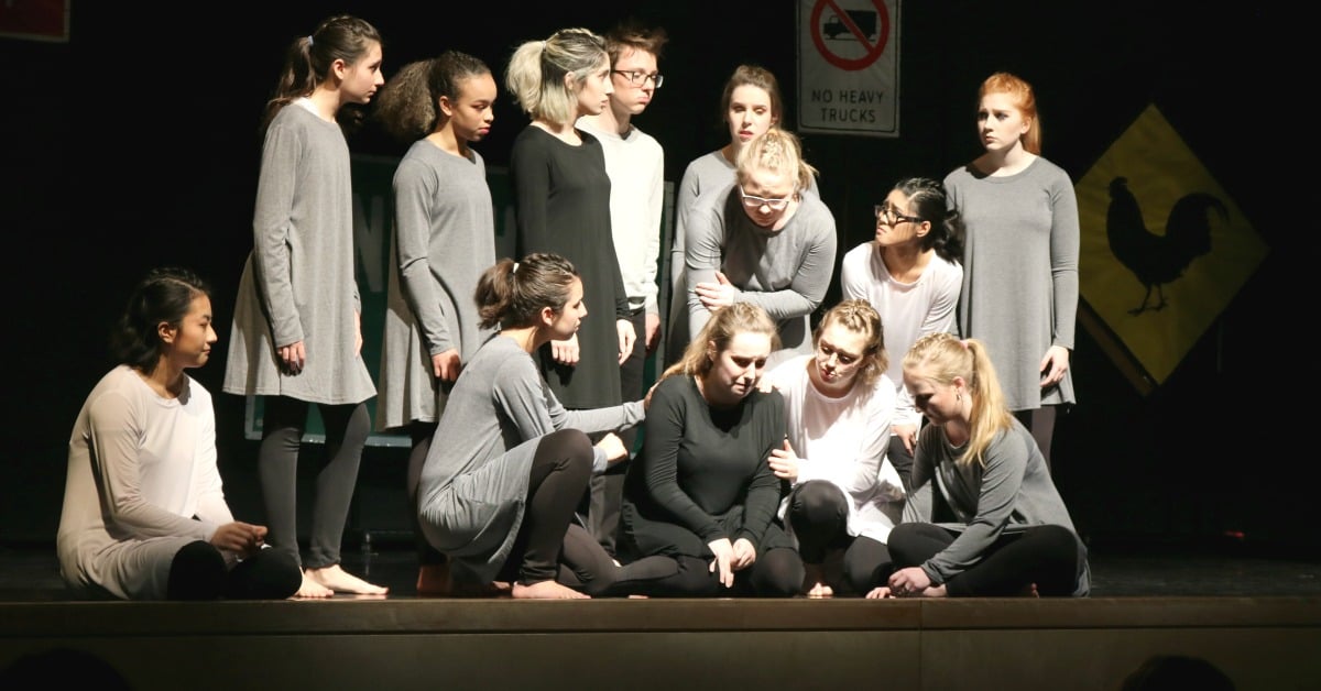 Director Lynne Comartin led the talented student performers at Tecumseh Vista Secondary School in Tecumseh, Ontario to a multi-award-winning performance. The show received Outstanding Production at the District level for the National Theatre School Drama Festival and advanced to the Regional level, where they received Awards of Merit for Monologue work and Ensemble Work. They were also able to spend time with the playwright, Lindsay Price, to have all of their questions asked and answered: