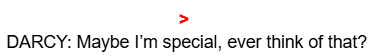 DARCY: Maybe I’m special, ever think of that? Huh? Maybe he likes me. // Me.