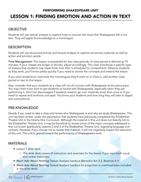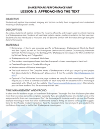 As a class, students will explore the tools of context, meaning of words, and imagery to unlock meaning in a Shakespearean text. Students will then use these tools to create a modern translation for their text. Students will also be introduced to resources and begin work on a monologue that they will continue to use throughout the unit.