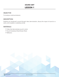 Students are introduced to sound through video demonstration, discuss the impact of sound on a scene, and complete a vocabulary activity.