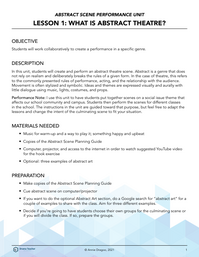 In this unit, students will create and perform an abstract theatre scene. Abstract is a genre that does not rely on realism and deliberately breaks the rules of a given form. In the case of theatre, this refers to the commonly presented rules of performance, acting, and the relationship with the audience. Movement is often stylized and symbolic. Ideas and themes are expressed visually and aurally with little dialogue using music, lights, costumes, and props.