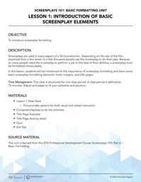 In this lesson, students will be introduced to the importance of screenplay formatting and learn some basic screenplay formatting elements: fonts, margins, and title pages.