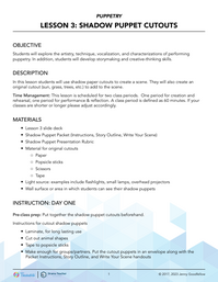Students learn how shapes create interesting dynamics in shadow puppets. Students will have a packet of shadow puppet cut-outs. These cut-outs include animals that can be attached to a popsicle stick. In groups/partners, students will use the cut-outs in the packet to create a scene. They will also create an original cut-out.