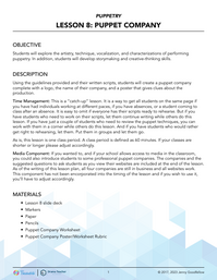 Using the guidelines provided and their previous scene, students will create a Puppet Company complete with a logo, the name of their production, and a picture that gives clues about the production. Students will also learn about professional puppet companies.