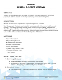 Students will write their own puppet play using the same format as the prewritten scene. In pairs, students will go over guidelines for creating a character and writing a scene.