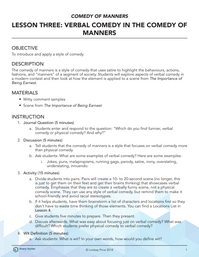 The comedy of manners is a style of comedy that uses satire to highlight the behaviours, actions, fashions, and “manners” of a segment of society. Students will explore aspects of verbal comedy in a modern context and then look at how the element is applied to a scene from The Importance of Being Earnest.