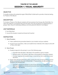 To introduce Theatre of the Absurd, students will look at photos from Europe after World War II to inform the reflection monologues they will write later. First, they will discuss an assigned photo in groups. Next, they will create group tableaux and write personal reflection monologues.