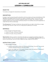This lesson looks at Breton's Manifesto of Surrealism, Atraud's Theatre of Cruelty, and the game of Exquisite Corpse. Students will create their own short surrealist play.