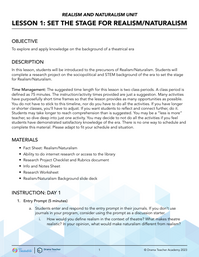 In this lesson, students will be introduced to the precursors of Realism/Naturalism. Students will complete a research project on the sociopolitical and STEM background of the era to set the stage for Realism/Naturalism.