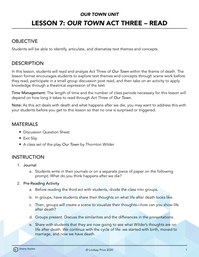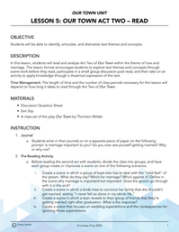 In this lesson, students will read and analyze Act Two of Our Town within the theme of love and marriage. The lesson format encourages students to explore text themes and concepts through scene work before they read, participate in a small group discussion post read, and then take on an activity to apply knowledge through a theatrical expression of the text.