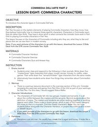 This lesson focuses on the characters of Commedia including who they are, what they’re like and places that we can see them in modern society.