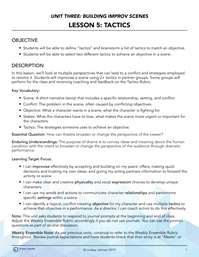 In this lesson, we’ll look at multiple perspectives that can lead to a conflict and strategies employed to resolve it. Students will improvise a scene using 2+ tactics in partner groups. Some groups will perform for the class and receiving coaching and feedback on the Tactics Rubric.